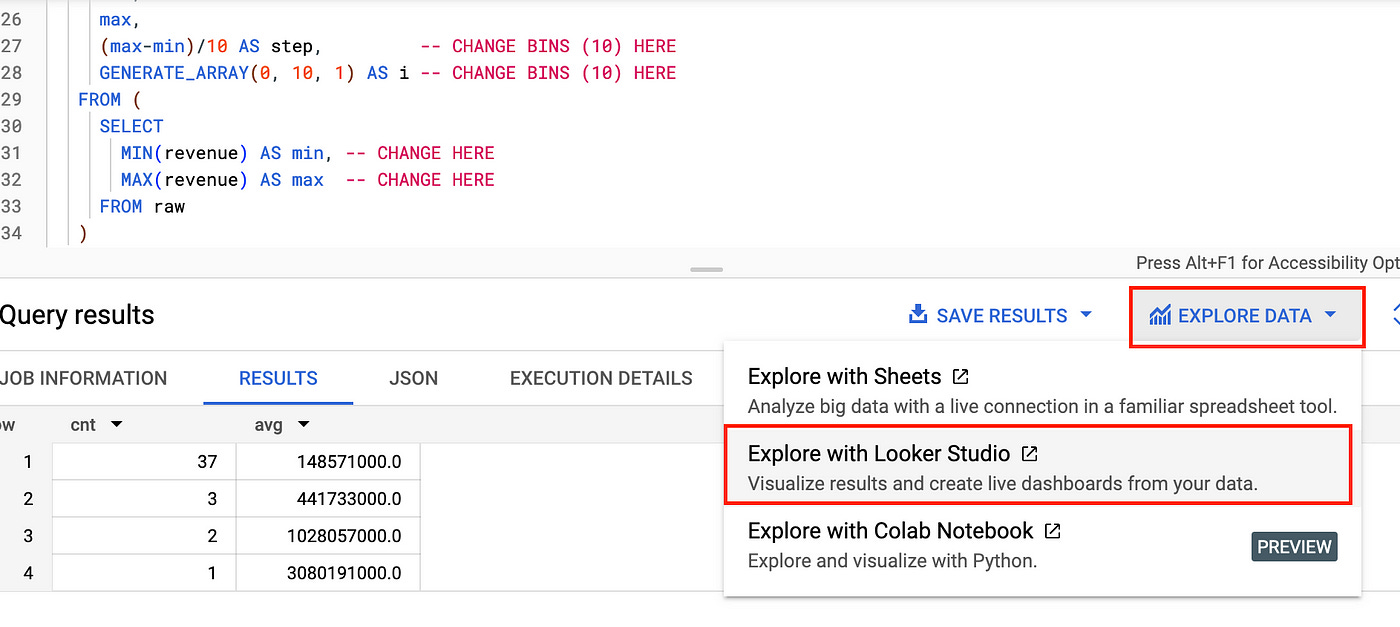 GENERATE_ARRAY(0, 10, 1) AS i -- CHANGE BINS (10) HERE